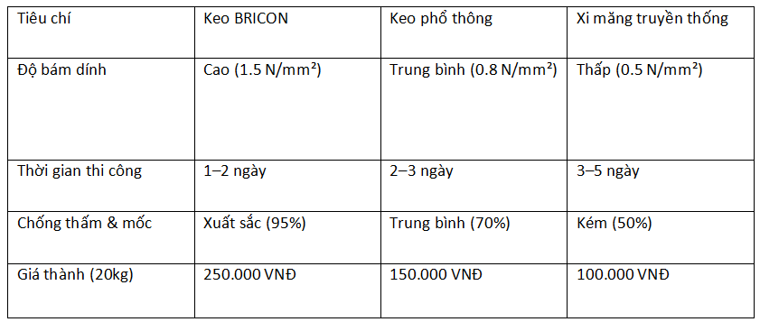 5. SO SÁNH NHANH: KEO BRICON VS KEO PHỔ THÔNG VS XI MĂNG